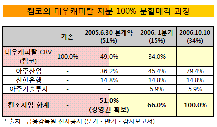 자산관리공사(캠코)는 2004년 오릭스 등 10여개 컨소시엄을 대상으로 대우캐피탈 M&A를 추진한 결과 아주그룹-신한은행 컨소시엄을 우선협상대상자로 선정했다. 매각대상은 지분 51%와 약 1조원에 달하는 대출채권 등이었다.