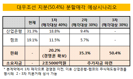 산업은행과 캠코가 매각하려는 50.4% 지분 가운데 40%만 매각할 경우 지분구도는 한화(20.2%)-산업은행(18.8%)-캠코(11.5%)로 정리된다. 이것만으로도 한화가 경영권을 확보하게 되는 셈이다.