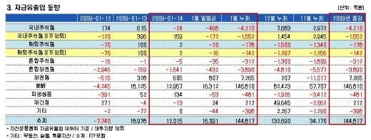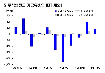 국내 주식형펀드에서는 24억원이 빠져나갔다. 하지만 ETF(상장지수펀드)를 제외한 주식형펀드로는 159억원의 돈이 들어와 이틀째 순유입 흐름을 이어갔다.