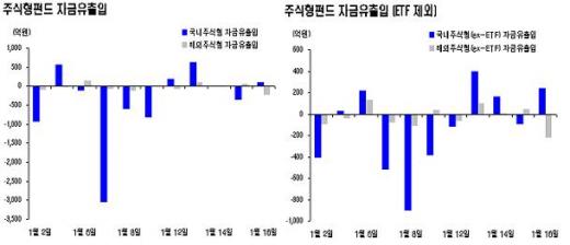 주식형펀드는 국내외 희비가 엇갈렸다. 국내주식형펀드는 94억원이 순유입돼 3거래일만에 유출세를 멈췄다. 상장지수펀드(ETF)를 제외한 일반 주식형펀드도 241억원이 수혈됐다.