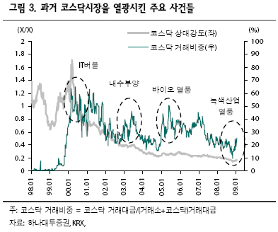 그는 특히 과거 IT버블과 바이오 열풍 사례에 빗대 현재의 '그린테마' 열풍이 단순 테마장세 이상이 될 가능성이 있다고 설명했다. "IT버블과 바이오 열풍 당시 코스닥시장에서 거래되는 금액은 각각 전체 국내증시 거래금액의 60%와 50%를 넘어섰다. 그에 비하면 지금은 미미한 수준이지만 코스닥으로 모아지는 관심과 늘고 있는 거래대금을 감안하면 충분히 의미를 둘 만하다"는 게 그의 설명이다.