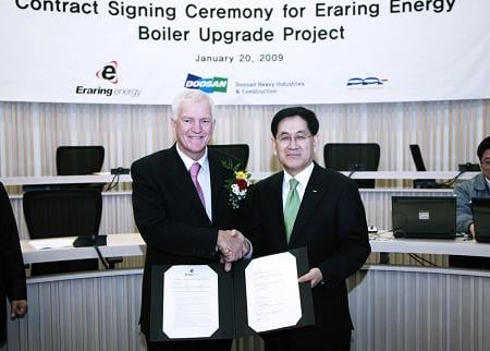 두산중공업은 21일 창원공장 게스트하우스에서 호주 에라링 에너지(Eraring Energy)의 피터 잭슨(Peter Jackson) 사장과 두산중공업 서동수 부사장 등이 참석한 가운데 에라링발전소(660MW급) 4기의 핵심기기인 보일러에 대한 7000만달러 짜리 성능개선 공사 계약을 체결했다고 밝혔다. 원화로 약 960억원에 해당하는 규모다.