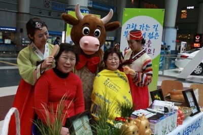 중외제약(29,000원 ▼50 -0.17%)이 설날 연휴를 앞둔 21일 서울 KTX 대합실에서 친환경염색약 ‘창포엔’ 설날 이벤트를 개최했다.