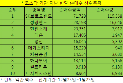 27일 증권선물거래소에 따르면, 기관은 지난 한 달간(12월23일~1월23일) 코스닥시장에서 2601억원을 순매수했다. 투신이 1802억원 순매수로 가장 많았고, 기금(435억원) 보험(272억원) 증권(119억원)도 매수세에 동참했다. 기관은 특히 올 들어 지난 12일과 13일 단 두차례를 제외하곤 순매수 행진을 계속 중이다.