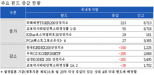 미래에셋TIGER200상장지수, 교보악사파워인덱스파생상품 1-B, KStar코스닥엘리트30상장지수펀드가 수탁액 순증가 상위펀드였다.