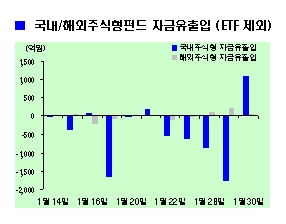 3일 자산운용협회와 굿모닝신한증권에 따르면 지난달 30일에 주식형펀드로는 1111억원의 돈이 신규 유입됐다. 하지만 1월 한달 동안은 8641억원이 빠져나갔다.