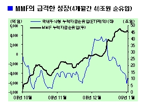 1월 한달 동안 가장 돈이 많이 들어온 곳은 역시 MMF였다. MMF로는 한달 동안 18조8028억원의 돈이 들어와 1일 평균 9896억원의 자금이 신규 유입됐다. 월말 자금 수요 등으로 지난달 28일과 30일 각각 1조1337억원과 4902억원의 돈이 빠져나간 것을 감안하면 매일 1조원 안팎의 돈이 쏟아져 들어온 셈이다. 주로 은행권의 자금으로 추정됐다. 한국은행이 기업 등의 자금수요 확충을 위해 돈을 풀었지만 정작 중간 창구인 은행들은 경기상황 등을 주시하며 단기자금 운용에 치중한 셈이다.
