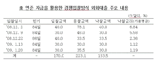 지난해 4분기 이후 국내 시중은행들이 단기외채 상환압력 등에서 벗어나는 등 외화자금 사정은 크게 개선됐고, 외화대출 평균 낙찰금리는 크게 하락했다. 1차 6.84%에서 5.58%→2.36%→1.12%→1.19%로 낮아졌다.