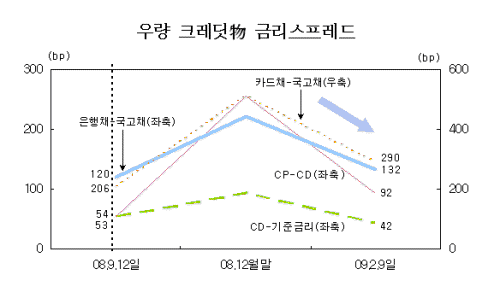 우량 크레디트물(은행채, CD, A1 등급 CP, 카드채 등)의 금리 스프레드(지표금리와의 차이)는 지난해 12월 이후 빠른 속도로 리먼브러더스 사태(08년 9월) 이전 수준으로 복귀중이라고 한은 측은 설명했다. 다만 BBB등급 회사채 등 비우량 장기 크레디트물의 금리 스프레드는 아직 리먼사태 이전보다 높은 수준이다.