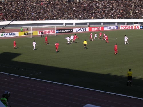 11일 삼성에 따르면 이날 수용인원 10만명 규모의 평양 김일성 경기장에서 펼쳐진 '2010년 남아공월드컵 아시아 최종 예선' 북한과 사우디전에 도시바, 엡손(EPSON), 기린(KIRIN), 코니카 미놀타, ING 등과 함께 SAMSUNG(삼성)과 HYUNDAI(현대)의 A보드(광고판)가 경기장 주변에 설치됐다.