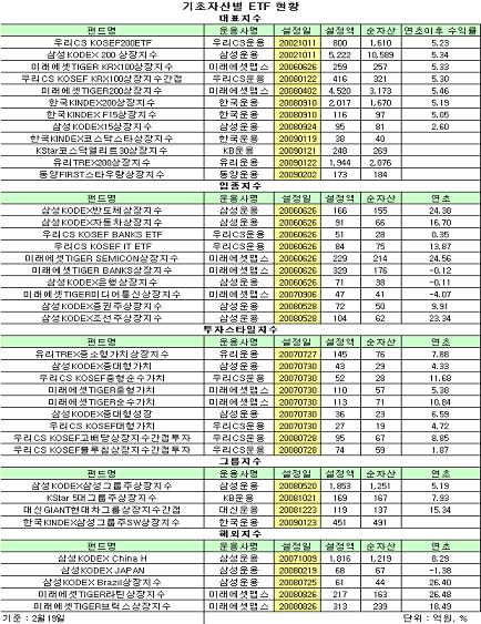 국내에 ETF가 첫 선을 보인 것은 지난 2002년 10월 11일. 당시 코스피200지수와 코스닥스타지수를 기초자산으로 하는 4개의 ETF가 증시에 상장돼 거래를 시작했다. 당시 ETF 순자산은 4000억원 정도.