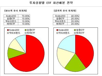 이처럼 ETF가 다양해지면 개인투자자는 보다 쉽고 저렴하게 자신의 투자성향에 맞는 포트폴리오 투자가 가능해질 전망이다. ETF만 가지고도 개인의 연령별, 투자성향별에 맞게 자산배분이 가능해지는 것이다. 예를 들어 노후자금 확보가 중요한 50대의 보수적인 개인투자자라면 채권과 주식 투자비중을 7:3으로 하되 직접 채권과 주식에 투자하지 않고 채권형와 주식형 ETF에 투자하는 식이다.