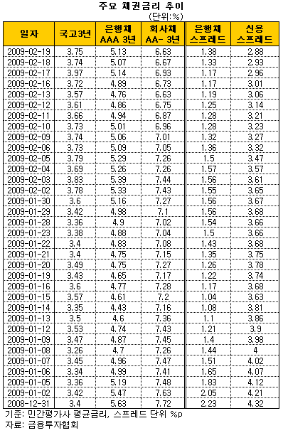 자산운용사들도 은행채 매입에 보수적으로 나서고 있다. 한 자산운용사 채권운용본부장은 "은행스프레드(국고채 3년물과 금리차)가 지난해 11월말 3.50%포인트로 고점을 찍은 후 현재 1.3%포인트대로 떨어진 만큼 가격 매력도 높지 않아 매수하기 부담스러운 상황"이라며 "은행채 불안은 최근 안정세를 찾던 신용채권 시장의 불안을 부르는 악순환 가능성도 우려된다"고 덧붙였다.