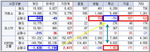 지난 주 코스피는 고삐풀린 망아지 마냥 아수라장이었다. 세력화된 선물시장, 투신권의 자극적인 프로그램매물에 장대음봉의 연속이었다. 금요일에는 다소 잠잠해졌지만 그동안의 수급구조인 외국인의 선물매도, 투신권의 일방적인 프로그램매물 구조는 여전하다.