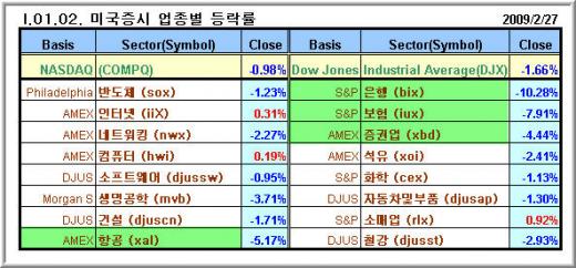 정부보유 씨티우선주의 보통주전환은 은행주 보유자들에게는 고약한 일이다. 그래서 씨티와 BOA의 주가가 폭락하면서 금융주가 하락세를 선도했다. 물론, 은행주주 이외의 금융시스템에을 안정시키는 효과가 있지만 시간이 걸리는 일이다. 다른 업종들은 경제지표의 부진만큼 조정이었다.
