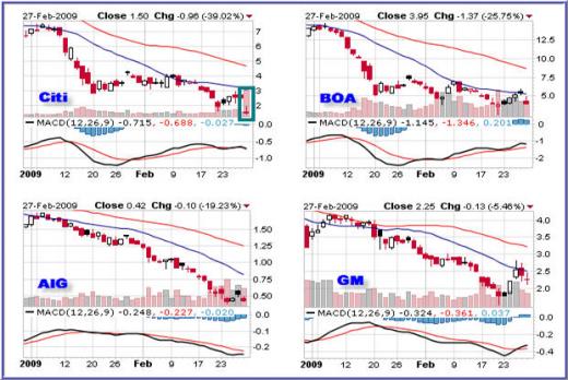 상업은행의 부실채권 처리방안과 국유화 불가피성의 논란이 이어지다가 씨티그룹의 정부지분 확대안이 발표되었다. 주식가치가 희석된 만큼 미국과 유럽의 금융주들이 일제히 급락했다. AIG와 GM의 경우도 정부의 처방을 기다리는 중환자들이다.