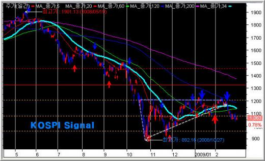 증권시장의 방향을 예측하는 것이 어렵다고들 한다. 그러나 시장신호는 어렵지 않다. 그것을 인지하는 관념의 벽이 철벽이라서 눈을 가리기 때문이다. 이것을 학습하고 수련하는 것이 주식의 맛을 느끼는 오감중 하나다. 신호의 발생지점이 항복점이니 그 지점에서는 급락하는 경우가 많다. 매도신호는 악재를 떼거지로 몰고 오듯이 이번에도 신호의 위력을 다시 실감했을 것이다. 그러나 지수하락의 여지는 그리 많지 않다. 단지 항복점에서 온 만큼의 시간이 하락의 상처를 아물게 하는 데 필요하다.