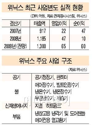 위닉스의 또 다른 강점은 최근 시장에서 귀한 대접을 받고 있는 대표적 '녹색기업'이란 점이다. '공기'와 '물'을 맑게 하는 제품을 생산한다는 점에서다. 특히 에어정수기는 대표적인 '그린제품'으로 손꼽힌다. 위닉스는 최근 냉각 및 열교환기 원천기술을 활용, 신재생에너지인 '지열' 사업에도 진출했다. 오는 5월부터 기존 시화공장의 생산라인을 활용해 지열 '히트펌프' 상용화에 들어갈 계획이다.