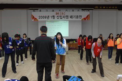 먼저 조직력 강화 훈련에서는 ‘나에게는 용기와 열정과 신념이 있다.’ ‘나는 자랑스러운 SK 인이다.’ 등의 구호를 107명의 신입사원들의 목소리가 한 사람 목소리처럼 들릴때까지 수 백번 반복하며 조직의 일체감을 느끼는 시간을 가졌다.
