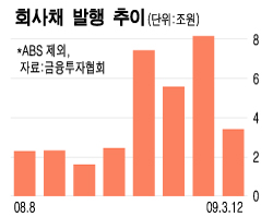 우리투자증권도 같은 기간 1조3059억원의 회사채를 판매했고, NH투자증권(7250억원)도 회사채 판매를 집중적으로 늘렸다. 이달 들어 회사채 발행액은 3조4120억원으로 리먼브러더스의 파산보호 시점인 지난해 10월 1조6123억원의 2배를 넘는 수치다.