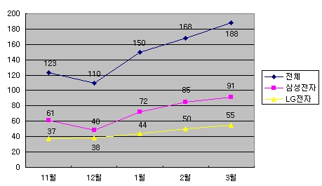 LG전자는 55만1000대를 팔아, 179만7000대 기준으로는 30.6%, 188만대 기준으로도 29.3%의 시장점유율을 기록하며 약진했다. LG전자는 시장점유율 30%대 돌파는 2000년 10월 이후 처음이라고 밝혔다.