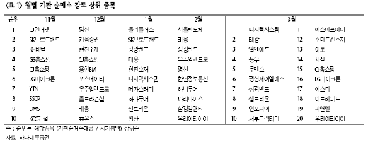 예컨대, 작년 12월 코스닥지수는 8% 가량 올랐지만 같은 달 기관 순매수 강도 상위 10개 종목의 평균 수익률은 20% 가량이었다. 올해 1, 2월에도 마찬가지였고 특히 지난달엔 코스닥 지수가 16% 오르는 사이 기관 순매도 강도 상위 10개사의 수익률은 44%에 달했다.
