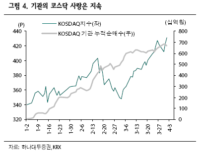 그는 이를 근거로 4월 증시에선 지난 3월 기관이 적극적 순매수를 보인 코스닥 종목을 주목해야 한다고 강조했다.
