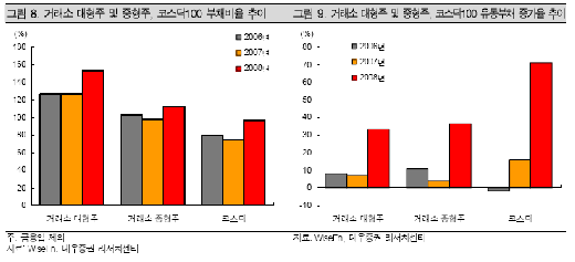 조승빈 대우증권 애널리스트는 "코스닥100종목의 경우 1년 안에 갚아야 하는 유동부채 규모가 빠르게 증가하고 있다"며 "당장 재무구조 악화를 걱정할 문제는 아니지만 향후 부채 변화 추이를 주의깊게 살펴야 한다"고 했다.
