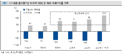코스닥보단 코스피 대형주와 중형주쪽에 관심을 가질 때가 됐다는 권고도 나왔다. 오태동 토러스투자증권 연구원은 "코스닥의 리스크 프리미엄이 낮아질 가능성이 높지만 코스피보단 높게 유지될 수 밖에 없고 코스닥을 선호했던 스마트머니가 다시 빠져나가면 급등한 종목이 피해를 볼 수 있다"고 말했다.