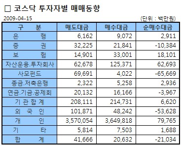 [표]코스닥 투자자별 매매동향- 15일
