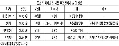 조 사장은 지난 2007년 7월 자산관리전문회사인 옥타곤파트너스를 설립한데 이어 같은 해 8월에는 엔이화와 부동산관리회사인 이화앤컴퍼니를 잇따라 만들었다. 또 최근에는 부동산임대 및 매매업을 전문으로 이화물산을 설립하는 등 부동산종합그룹으로 변신을 꾀하고 있다.
