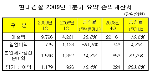 현대건설은 2009년 1/4분기 집계 결과 총 1조9796억원의 매출을 기록, 지난해 같은 기간에 비해 38.8% 정도 늘어난 것으로 파악됐다.