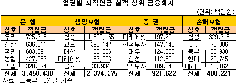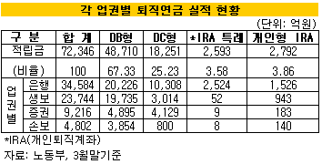 이 가운데 은행은 확정급여형(DB)형에서 2조226억원의 적립금을 운용해 전체의 41.5%를 차지했고 생보사는 1조9735억원(40.5%)으로 시장을 양분했다. 증권사는 4895억원(10%)에 그쳤다.