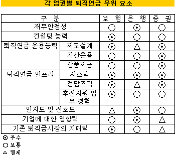 은행과 보험의 2강체제, 그리고 증권사의 선전. 퇴직연금제도 도입 후 3년이 지난 시점의 시장구도다. 특히 증권사는 퇴직연금 운용을 근로자가 책임지는 확정기여(DC)형 분야에서 두각을 나타내 퇴직연금시장의 판도 변화를 예고한다.