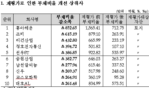코스피 상장사들의 자산재평가로 부채비율이 41%포인트 감소하는 효과가 있는 것으로 나타났다.