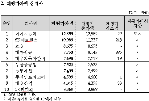 재평가차액이 가장 큰 종목은 기아차(1조2859억원), SK네트웍스(1조989억원), 효성(8675억원), 대한항공(7753억원), 대우자동차판매(7698억원) 순으로 조사됐다.