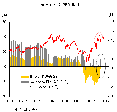 이승우 대우증권 연구원은 "이달 들어 가파른 기업 이익 상향 조정 속에서 한국 증시의 밸류에이션 부담이 완화되기 시작했다"며 "밸류에이션 부담을 가격 조정으로 해소하기 보다는 사후적인 이익 상향과정이 밸류에이션 부담을 해소할 것이라는 전망이 맞아 떨어지기 시작한 것"이라고 분석했다.