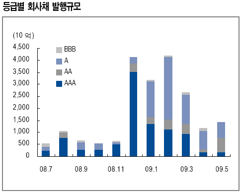 올 들어 신용경색 해빙에 힘입어 회사채 발행이 순조롭게 진행되고 있다. 하지만, 신용등급이 낮은 기업은 채권을 발행하는데 여전히 녹록치 않은 것으로 나타났다.