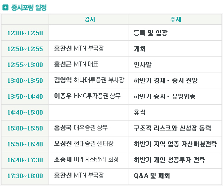 전환기를 맞이한 이 때 MTN이 마련한 증시포럼은 시청자와 투자자에게 투자의 길잡이가 될 것입니다. 대한민국 최고의 강사들이 제시하는 하반기 증시 전망 및 성공투자전략, 투자자 여러분들의 많은 관심과 참여를 부탁드립니다.
