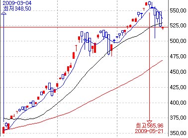 28일 오전 9시46분 현재 코스닥지수는 전날보다 2.02포인트(-.39%) 내린 522.31을 기록 중이다. 이날 지수는 520.67로 출발한 뒤 곧바로 510선대로 내려섰다. 그러나 외국인이 소폭 순매수로 전환하면서 낙폭이 축소됐다.