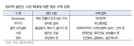 윤 연구원은 "원자력 발전은 국가 안보와 직결된 프로젝트이고, 안정성에 대한 우려가 존재하기 때문에 기존에 사업을 영위하여 노하우를 축적한 업체에 수혜가 예상된다"고 밝혔다.