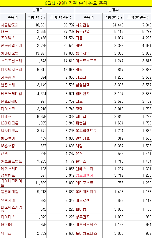 기관 매도 종목은 크게 대형 테마주, 새내기 공모주, IT부품주로 나뉜다. 테마주 중에선서울반도체(9,860원 ▲1,100 +12.56%)(307억원)차바이오앤(17,190원 ▲60 +0.35%)(190억원)태웅(44,700원 ▼5,500 -10.96%)(277억원),현진소재(95억원)마이스코(67억원)용현BM(2,110원 ▼35 -1.63%)(30억원) 등 풍력주와 바이오, LED 업체가 주종을 이룬다.