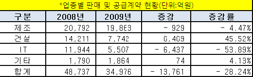 업종별론 IT 관련 계약 총액이 5507억원으로 전년 동기에 비해 54%나 감소했다. 건설 관련 계약금액 역시 7742억원으로 46% 급감했다. 지난 해 같은 기간 IT와 건설 관련 계약금액은 각각 1조1944억원과 1조4211억원이었다.