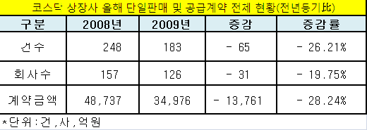 올해 코스닥 상장사의 단일판매 및 공급계약 건수는 모두 183건으로 전년 동기 248건에 비해 26% 줄었다. 계약을 체결했다고 공시한 회사수도 지난 해 같은 기간 157개에서 126개로 20% 가량 감소했다.