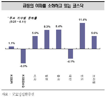 김중현 애널리스트는 이날 "북핵사태 이후 코스닥지수는 6% 하락해 대부분 상승세를 나타낸 여타 증시들에 비해 크게 뒤쳐지는 성적을 기록했다"며 이렇게 말했다.