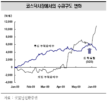 김 애널리스트는 "코스닥 조정 과정에서 올해 코스닥 1차 상승국면을 주도했던 투신권 자금이 대거 이탈하고 있는 반면 개인 매수세가 재차 늘어나는 추세"라며 "코스닥의 특성상 개인 매수가 시장을 되돌릴 가능성이 없다고 말하긴 어렵지만 기관 매수 이탈은 유의해서 지켜봐야 한다"고 했다.