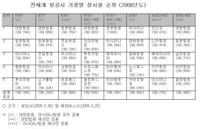 대한항공은 21일 국토해양부 항공안전본부를 발표를 인용해 보잉과 에어버스, 양대 항공기 제작사가 지난해 자사 항공기를 운영하는 전 세계 항공사의 운항실적을 조사한 결과 대한항공이 현재 운영 중인 5개의 기종 가운데 4개 기종이 세계 1위의 운항 정시율을 보였다고 밝혔다.