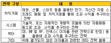 예컨대 국채선물이나 고정금리와 변동금리를 주고받는 스와프시장을 활용해 헤지(위험회피)하거나, 종류가 다른 채권간 금리차를 활용한 스프레드 매매 등 차익거래 전략 등이다. 또 전환사채(CB)나 신주인수권부사채(BW) 등 주식연계채권에 투자하거나 기술적 지표를 활용한 자동매매 시스템으로 초과수익을 추구하는 전략 등 절대 수익률을 올릴 수 있는 상품을 제안한 곳에도 자금을 집행할 계획이다.