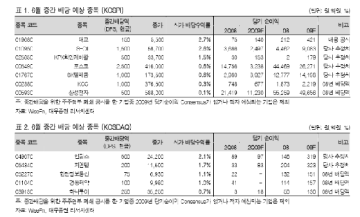대우증권은 배당수익과 함께 투자리스크를 줄여준다는 점에서 6월 중간배당 예상 종목에 주목하라고 26일 조언했다.