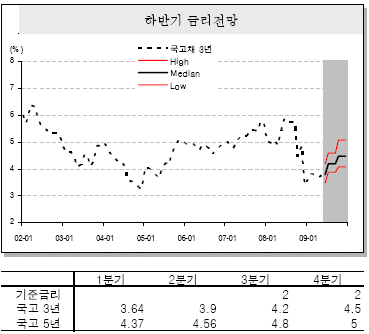 동양종금증권(4,550원 ▲30 +0.66%)은 하반기 채권시장 전망에 대해 금융시장 안정속에 그간 유동성 장세에서 펀더멘털로 넘어가는 과도기라고 보고, 채권금리는 점점 상승세를 탈 것이라고 밝혔다.